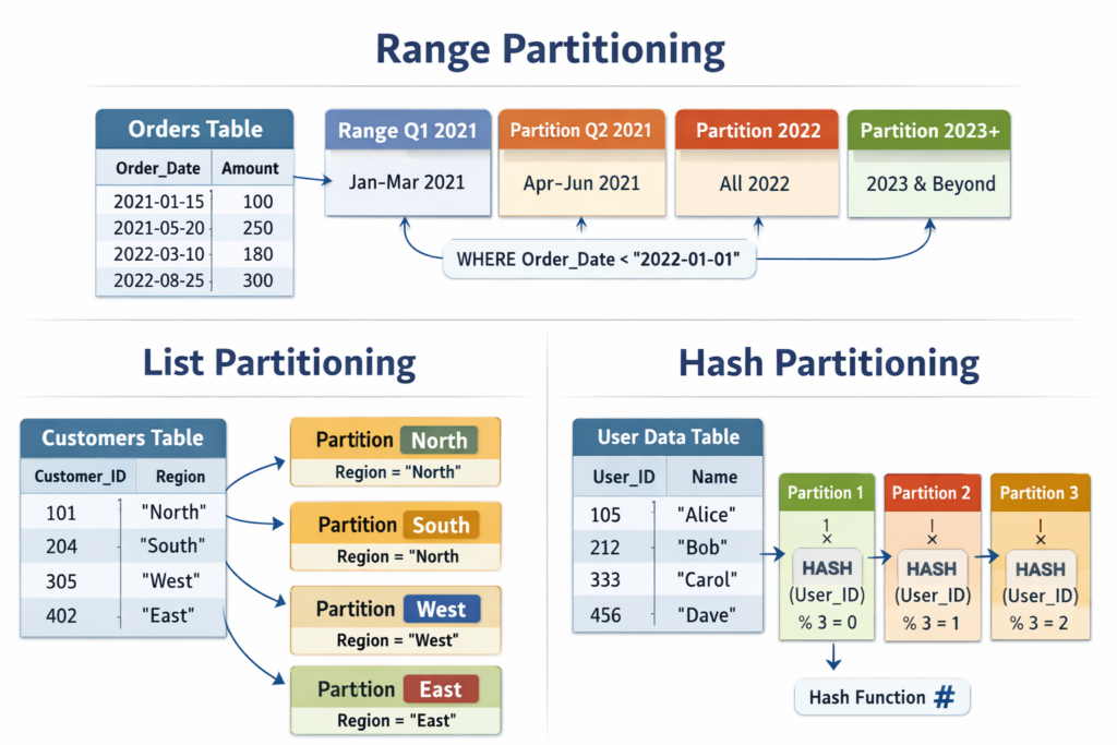 Salestheo cộtOrderDate. Mỗi phân vùng chứa dữ liệu của một tháng hoặc một quý. - Khi nào dùng: Cực kỳ hoàn hảo cho dữ liệu chuỗi thời gian (time-series) như logs, giao dịch, dữ liệu cảm biến IoT.